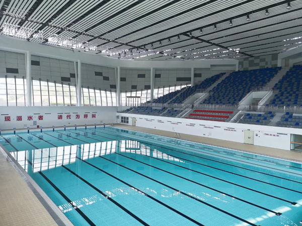 按環評公示,游泳館建筑面積約8090平方米,建筑總高度(室外地坪——網架頂部)約21米,共3層,按達到承辦地區單項比賽的乙級游泳館標準進行設計。館中心比賽場地尺寸為59.9×35.9米,包含一個50米×25米十根道的標準泳池。二層為觀眾活動區,觀眾可由室外的大平臺直接到達二層觀眾入口大廳,再進入座席區。看臺區采用單側看臺設置,觀眾席座位數為1500座。游泳館機電設備設計施工由“水環境領航者”——聯盛水環境工程有限公司承建。