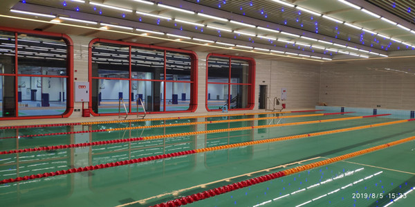 游泳池面積337.5平方米,有效水深1.2-1.8米,容積506.25立方米,循環時間3.2小時。水處理工藝設計中,采用了循環式水質維護系統和分流量臭氧消毒系統相結合。系統設計中運用現代科技,過濾系統采用了目前高標競賽池常用的硅藻土過濾設備,消毒系統結合了長效(氯)+瞬間(臭氧)消毒方式,從而保證了游泳池最優的水質;熱源采用鍋爐供熱;為保證游泳館空間的舒適性,泳池空間恒溫系統采用多功能除濕熱泵機組,游泳館內還設置了地暖。