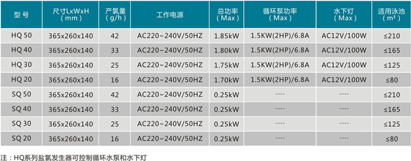◎HQ系列鹽氯發生器可控制循環水泵(1臺)、水下燈(1組),可實現泳池的自動化控制。