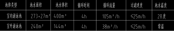 室內外泳池循環方式均采用池水逆流循環,分流量全程式臭氧+長效氯消毒方式,泳池專用型空氣源熱泵加熱,多功能除濕熱泵進行室內空氣除濕,回收熱量對池水、空氣進行加熱。