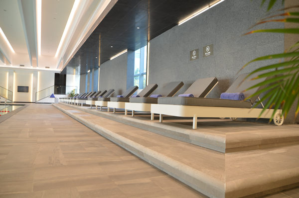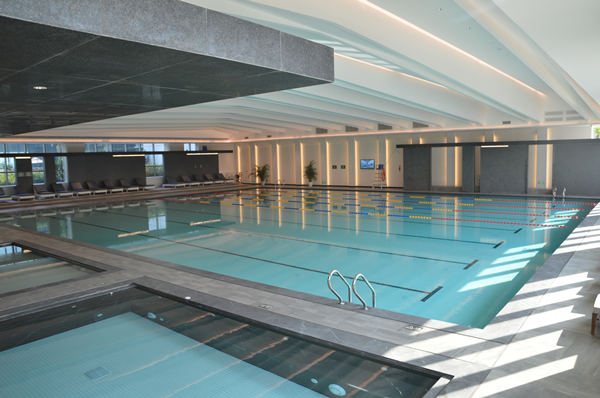 君康軒的恒溫游泳池、兒童池和按摩池由“水環境領航者”——聯盛水環境工程有限公司打造。消毒工藝采用了電解鹽的方式,將食鹽投入池中,把池水變成與人體含鹽量相當(池水含鹽量2500-5000ppm,人體含鹽量4000ppm)的水質,再通過在線電解鹽生成活性氯和活性氧,實現氯和微臭氧的消毒效果,此時的水環境更舒適和健康。食鹽作為一種日常用品,在采購、運輸、儲存和投加方面都非常的方便,相對于泳池的其他消毒工藝來說這是一種較經濟的消毒方式。