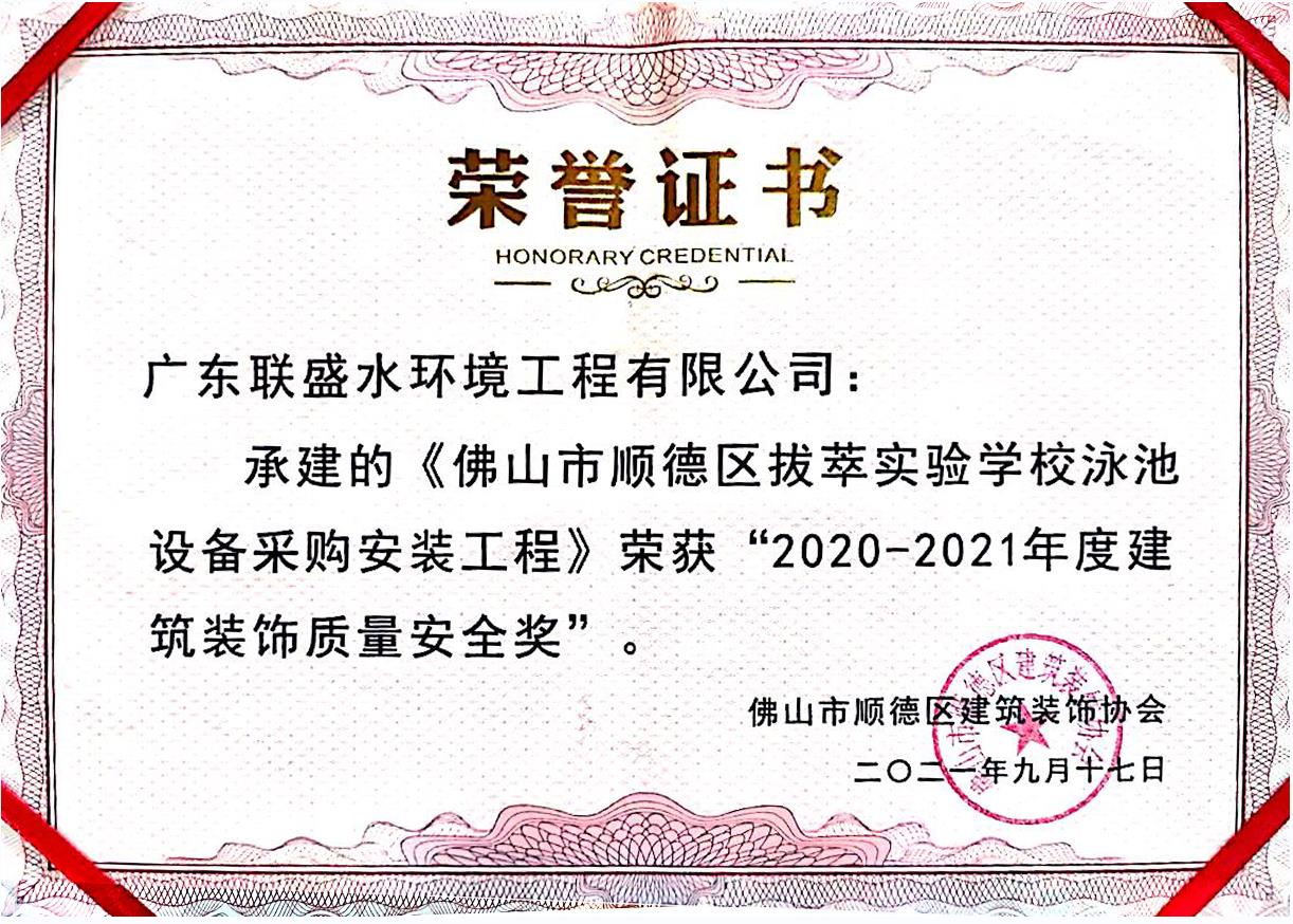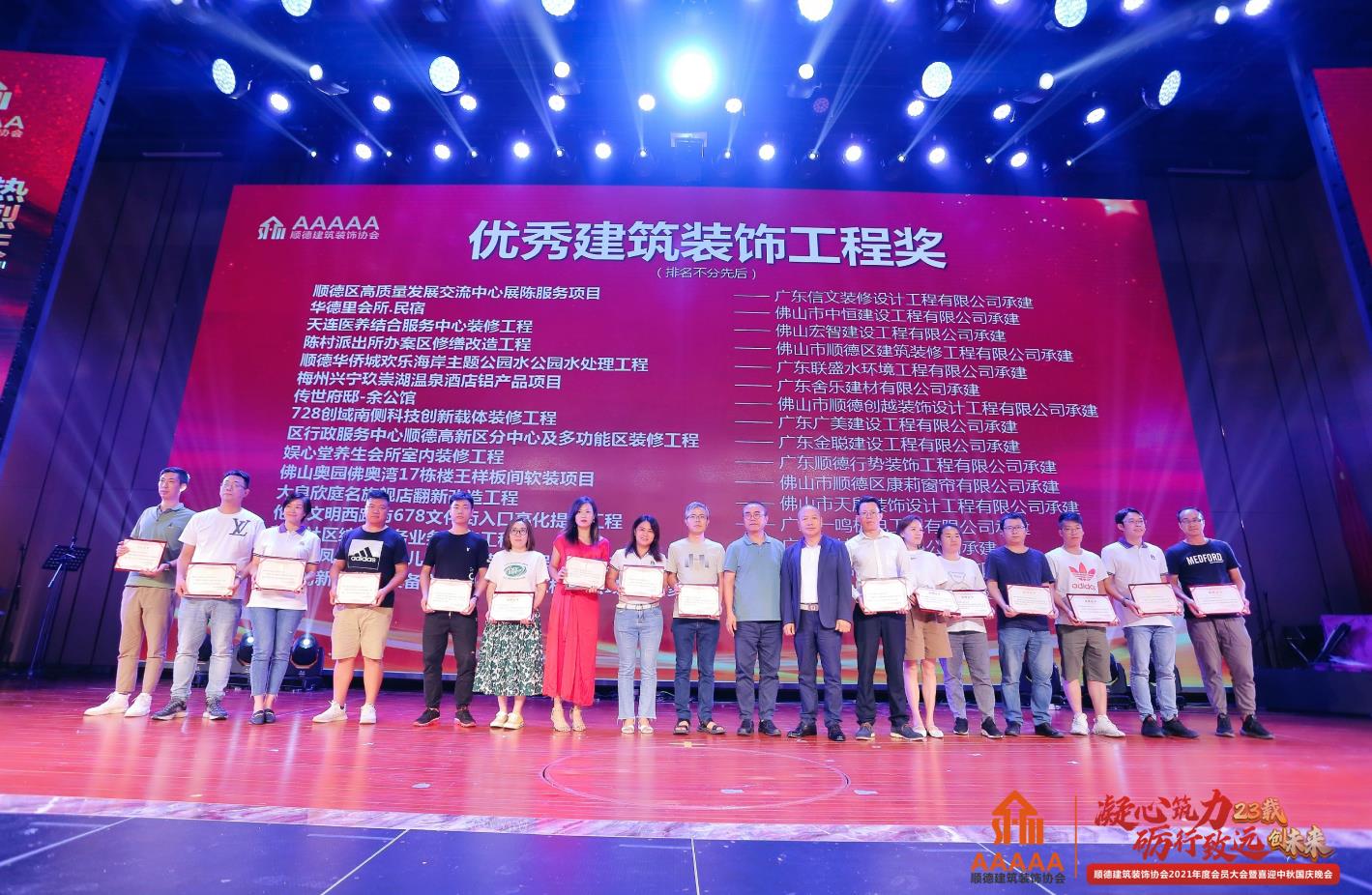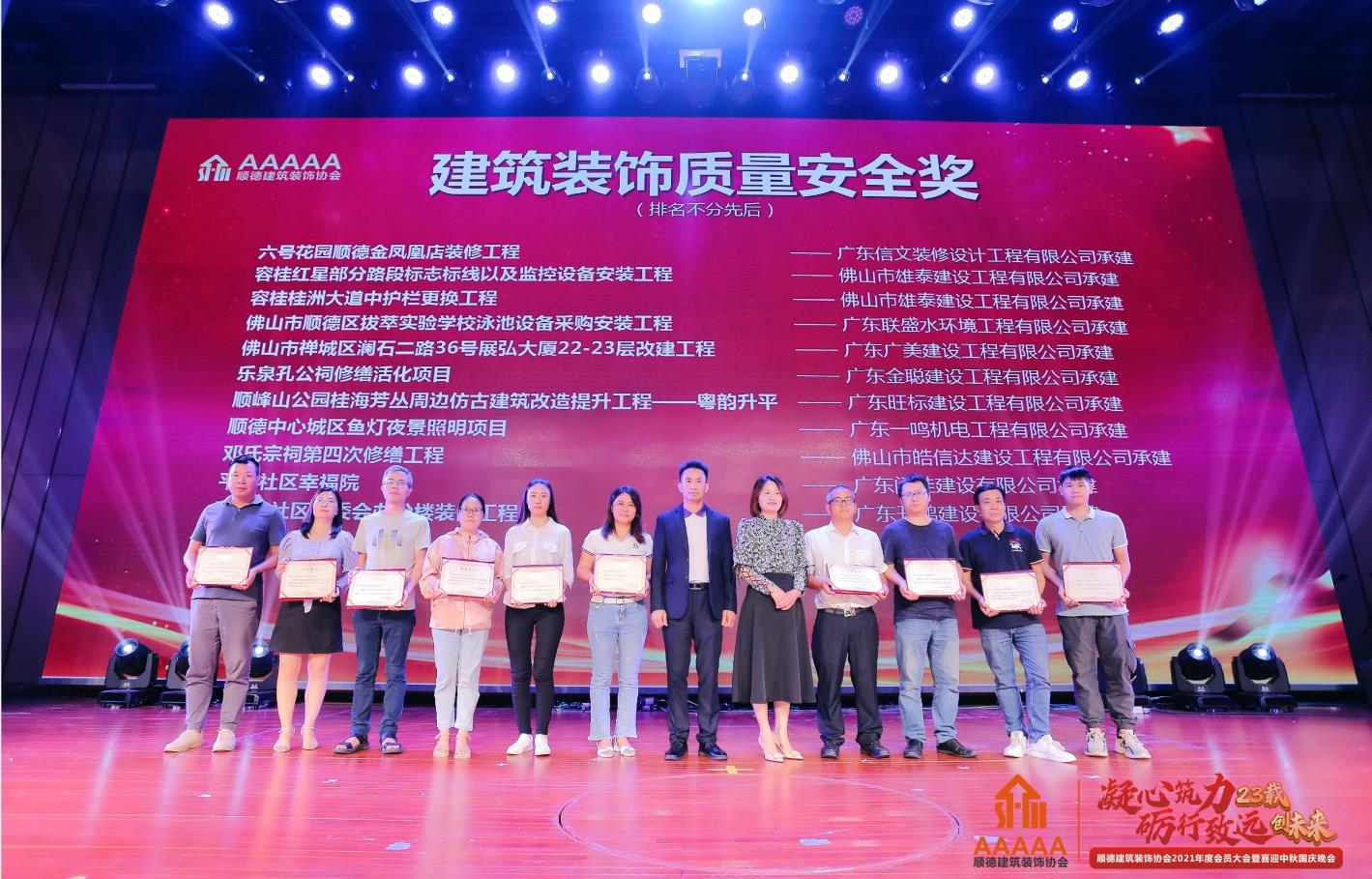 在協(xié)會(huì)舉辦的頒獎(jiǎng)儀式中,聯(lián)盛公司榮獲“2020-2021年度建筑裝飾行業(yè)優(yōu)秀建筑裝飾企業(yè)獎(jiǎng)”,且憑借承建的順德華僑城歡樂海岸主題公園項(xiàng)目榮獲“2020-2021年度建筑裝飾優(yōu)秀工程獎(jiǎng)”,順德拔萃實(shí)驗(yàn)學(xué)校項(xiàng)目榮獲“2020-2021年度建筑裝飾質(zhì)量安全獎(jiǎng)”。作為贊助企業(yè),聯(lián)盛公司也獲得了協(xié)會(huì)頒發(fā)的關(guān)于支持協(xié)會(huì)共享基金捐贈(zèng)及晚會(huì)贊助的感謝狀!