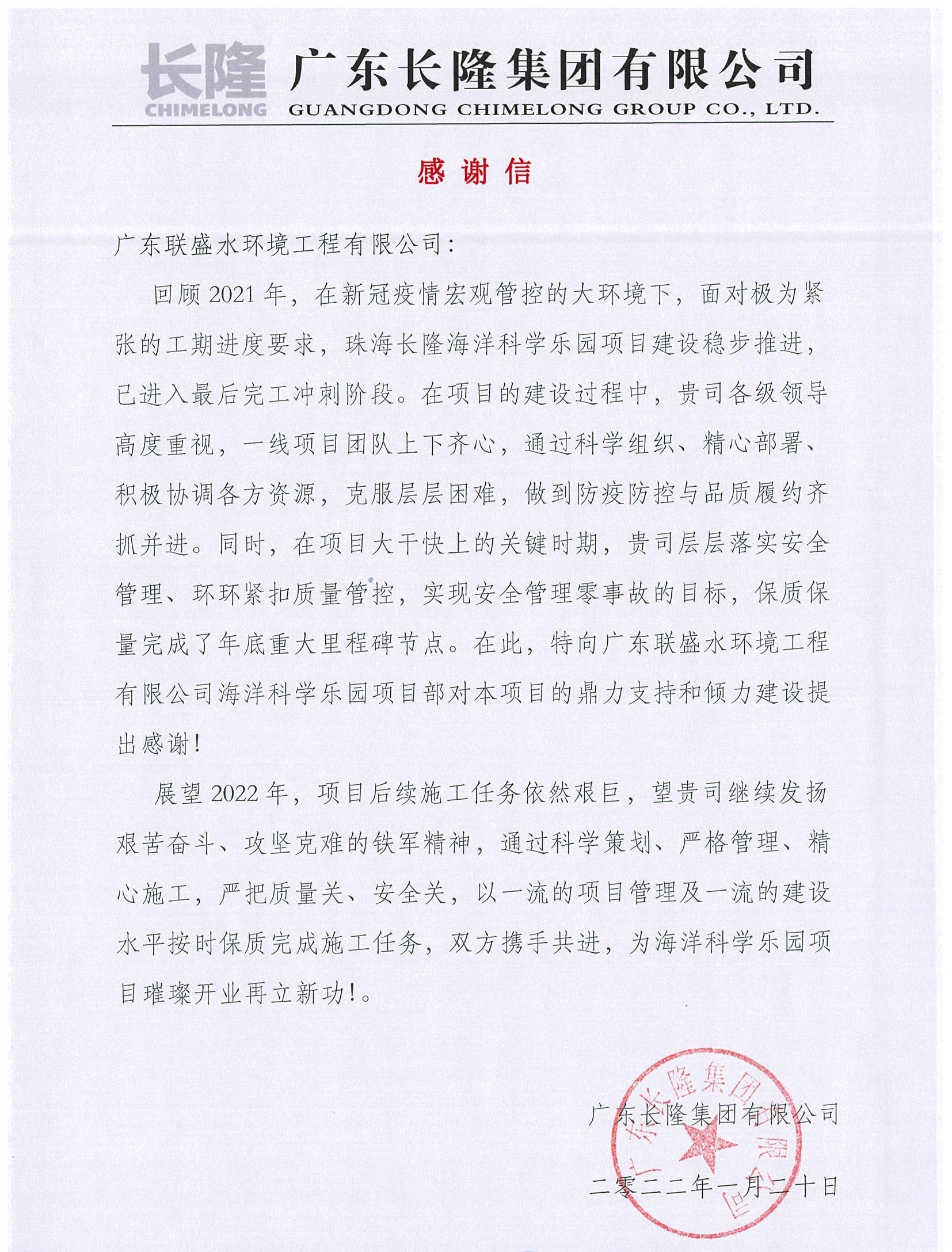 近日,廣東聯(lián)盛水環(huán)境工程有限公司收到了一封來自廣東長隆集團(tuán)有限公司的感謝信,信內(nèi)容如下: