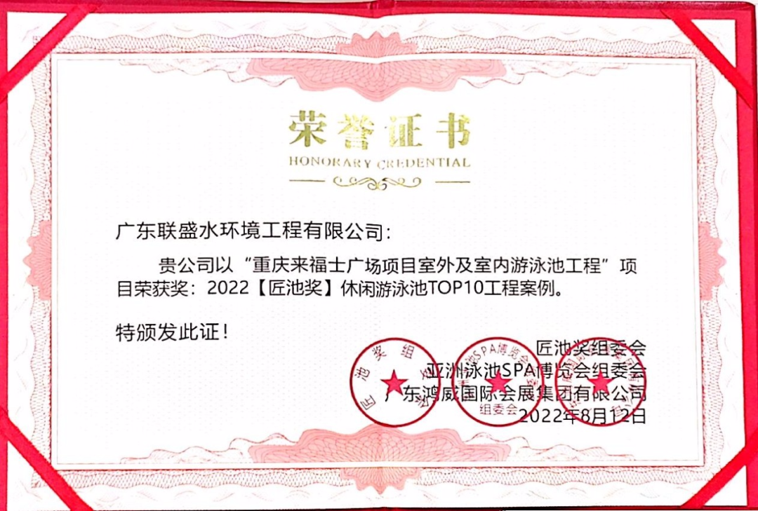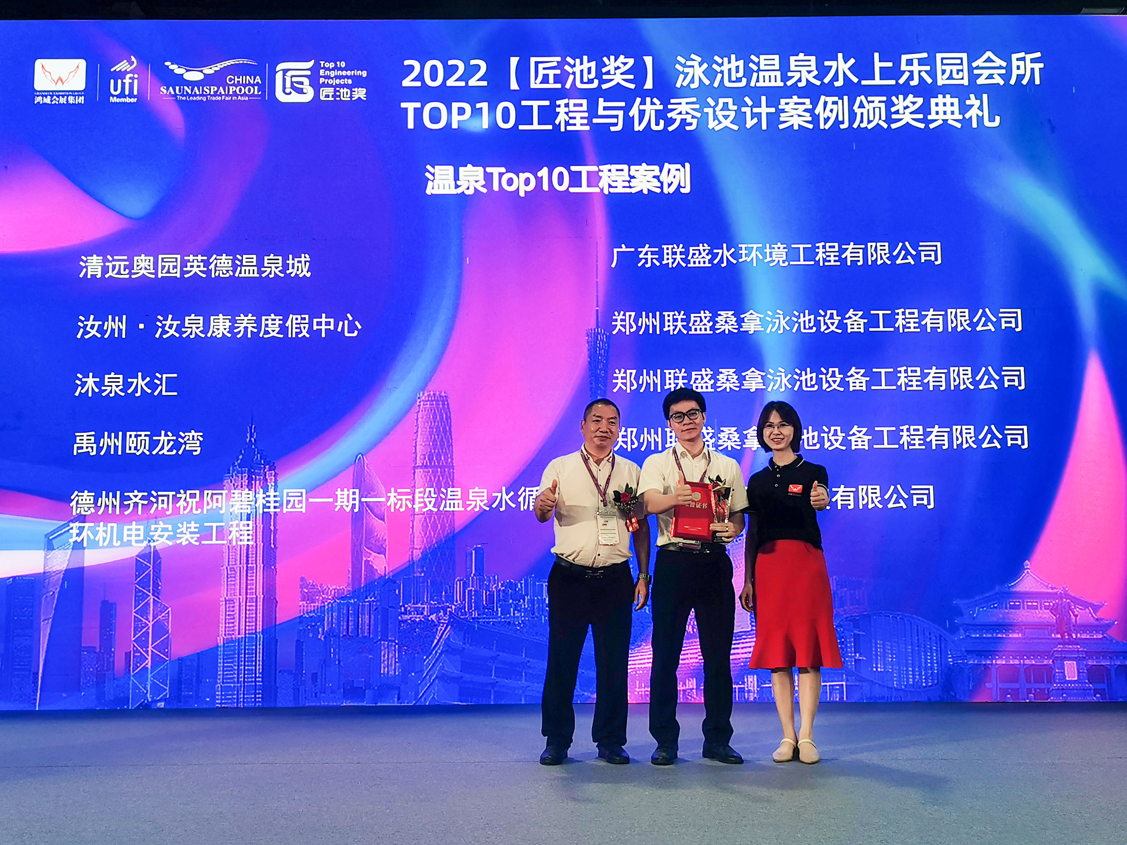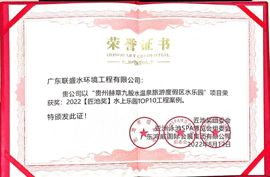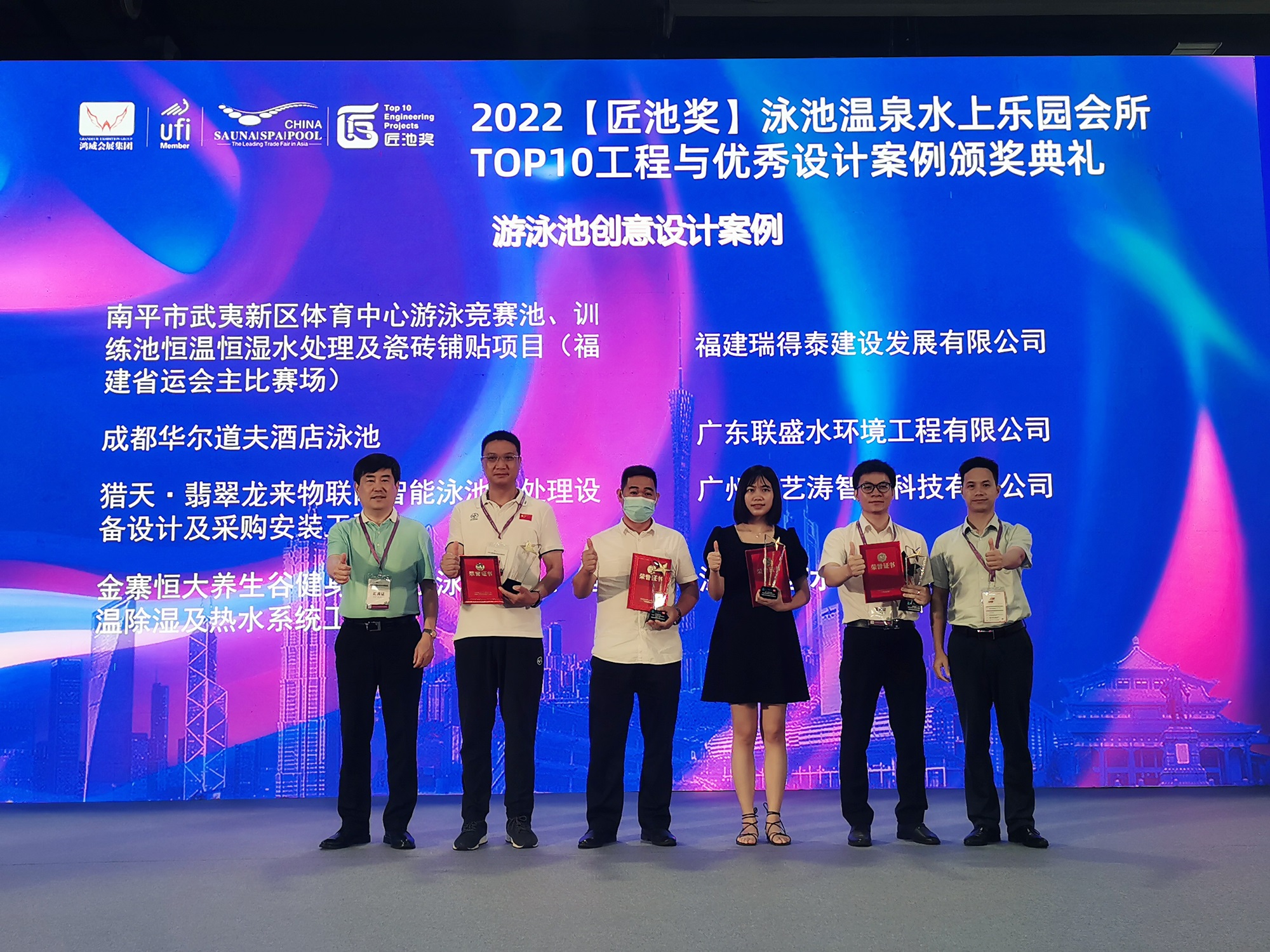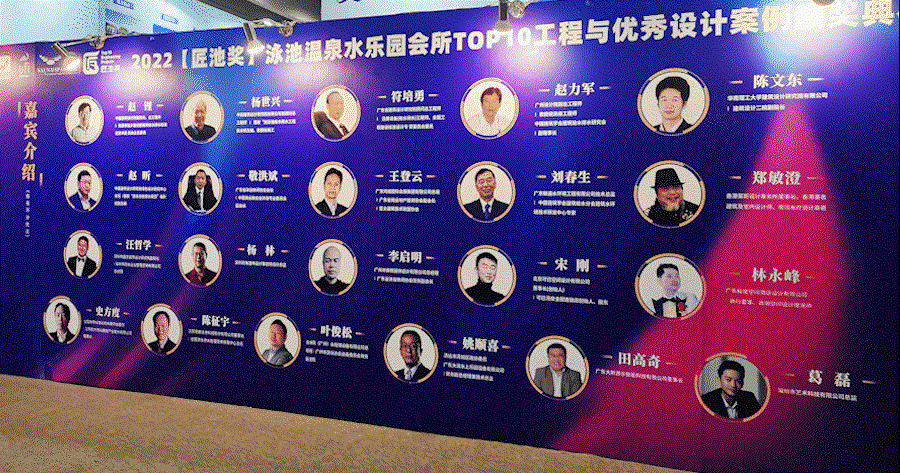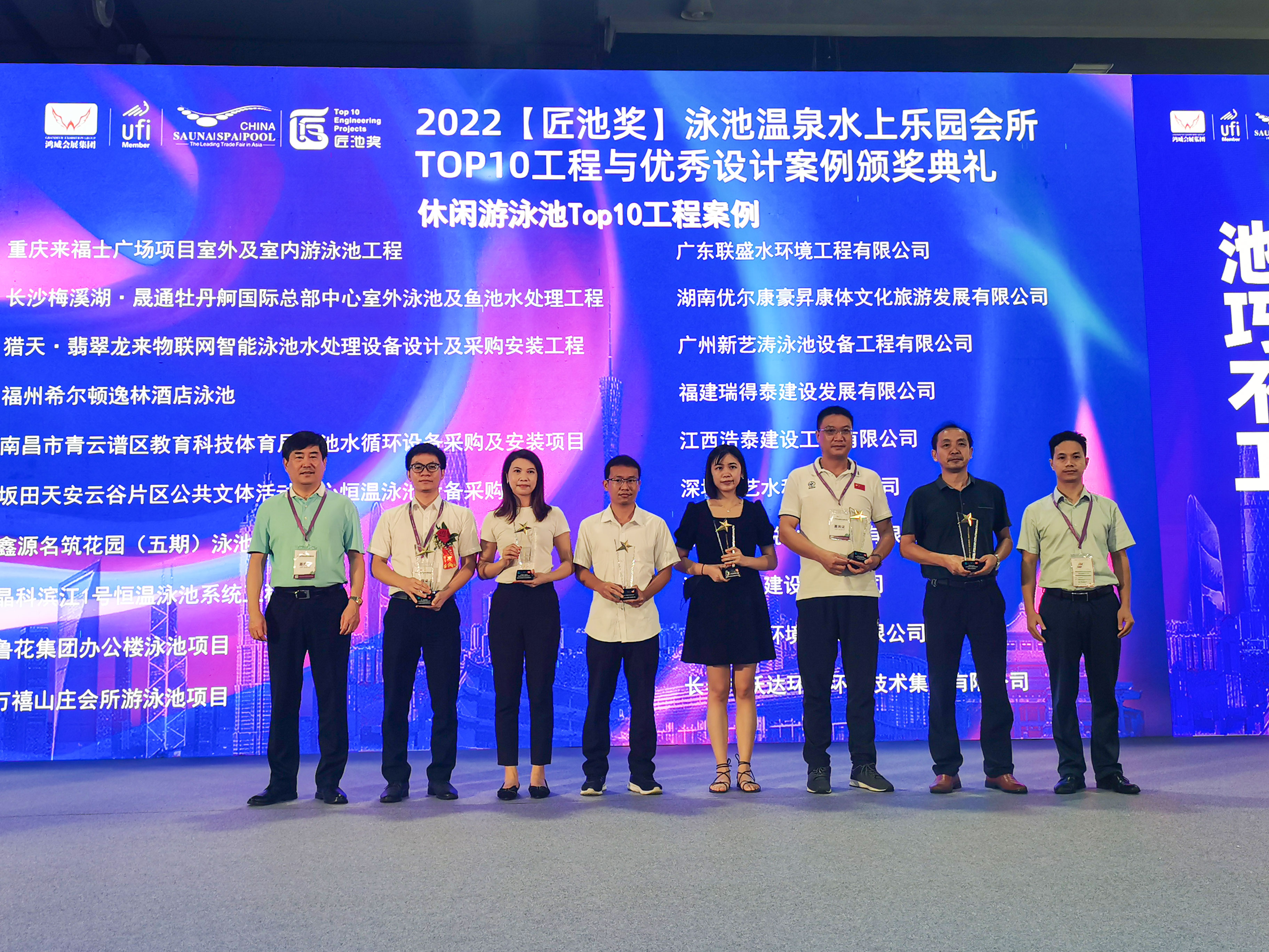 2022年8月12日,2022年匠池獎TOP10工程案例頒獎典禮在廣州·廣交會展館舉行,現場一批行業專家、品牌企業及知名設計師蒞臨參加,共同見證了溫泉Top10工程案例、泳池Top10工程案例、水上樂園 Top10工程案例、Top10創意設計獎等優秀獎項的評選和頒發。