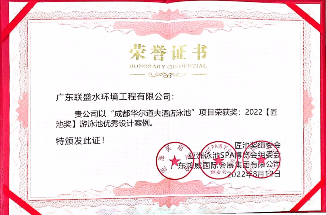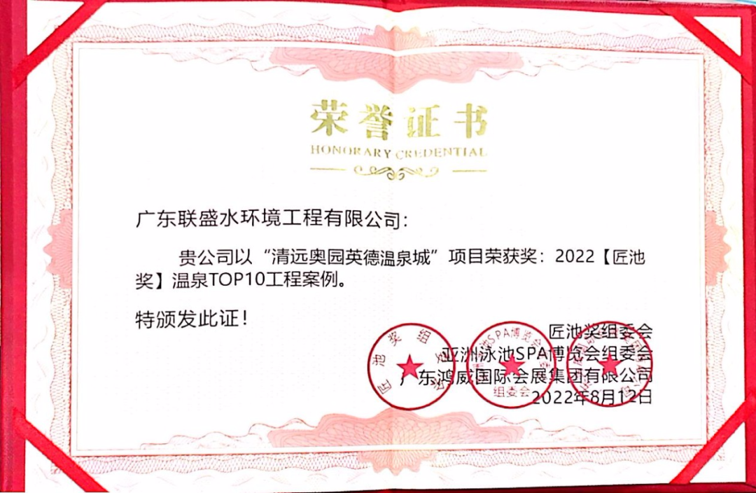 匠池獎已成功舉辦了多屆評選活動,每年歷經9個月的優秀工程案例征集和評選,通過專家點評和網絡投票評選出了眾多的優秀工程案例。“水環境生態行家”——廣東聯盛水環境工程有限公司憑借在泳池、溫泉、水上樂園領域的品質工程,連續多年獲得了諸多榮譽。