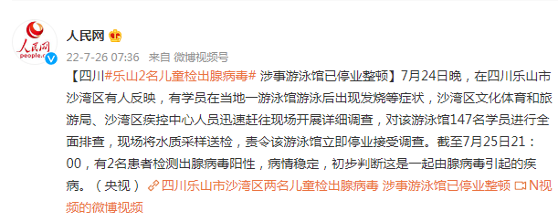 除了以上基本指標,泳池水處理不徹底,還可能引發其它疾病。7月24日,140余名孩子在四川樂山沙灣區星躍動游泳館游泳后出現發燒發炎,有家長懷疑其水質問題,后有2名患者檢測出腺病毒陽性。