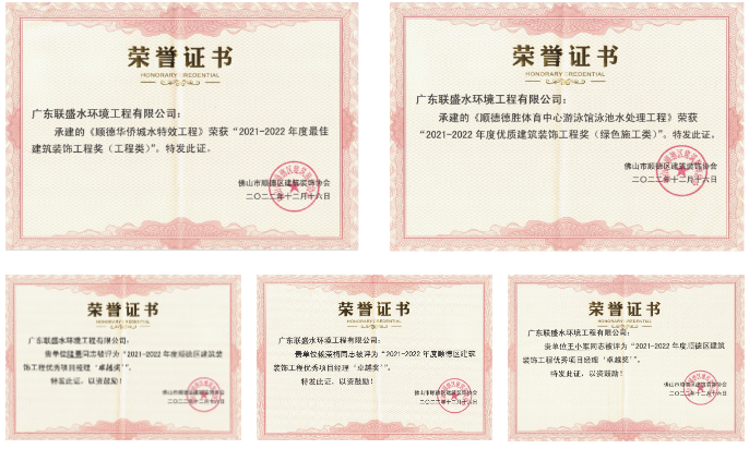 在頒獎儀式中,聯(lián)盛公司憑借承建的德勝體育中心游泳館泳池水處理工程榮獲“2021-2022年度優(yōu)質(zhì)建筑裝飾工程獎(綠色施工類)”,順德華僑城水特效工程榮獲“2021-2022年度最佳建筑裝飾工程獎(景觀提升類)”。