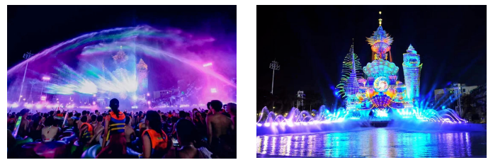 水幕屏障長52米、高30多米,視野覆蓋整個造浪池區(qū)。以水光矩陣、50臺光束水柱、100米霧森特效、60套動感二維水柱、14套氣爆、6套互動式加特林水槍、激光等表演形式,營造出一幕幕環(huán)繞式、互動式、立體式的裸眼激光沉浸式視覺盛宴。